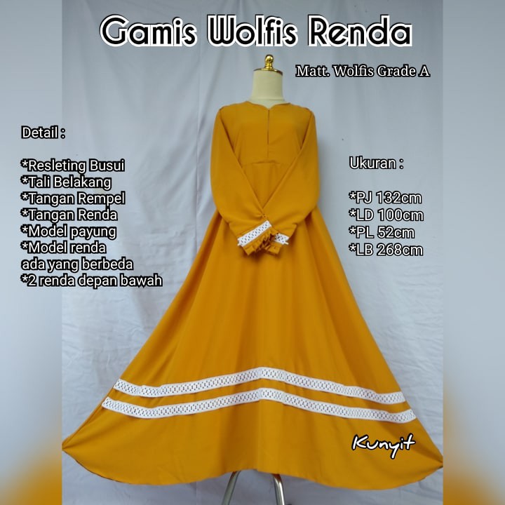 Gamis wolfis polos kombinasi renda. Bahan tidak nerawang adem dipakai tidak mudah kusut dan anti luntur.